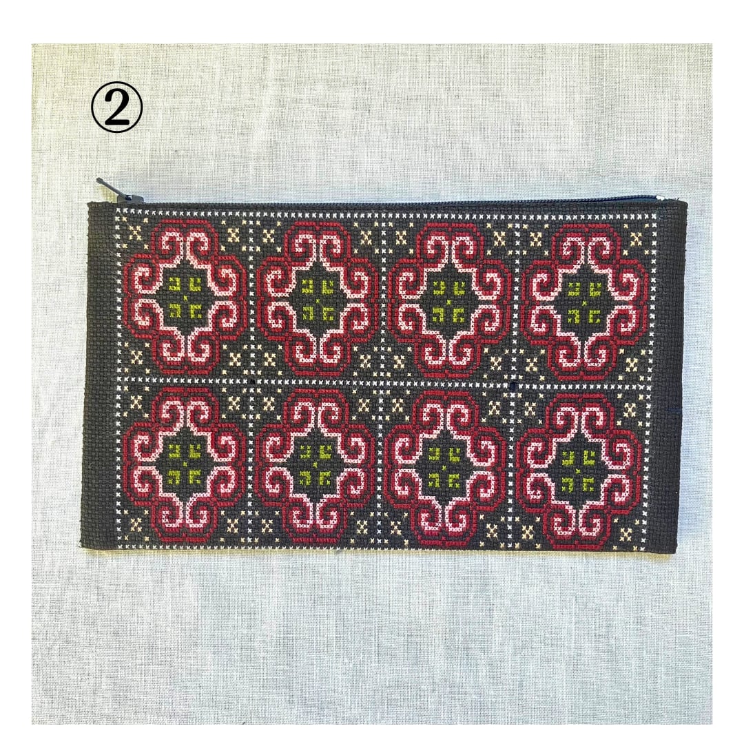 クロスステッチが特徴の刺繍生地を贅沢に使った大きめサイズのポーチです。